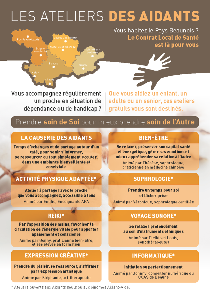 Dans le cadre du Contrat Local de Santé, le Pays Beaunois propose des ateliers d’information et de détente-relaxation aux proches Aidants du territoire. Ces séances ont pour ambition de permettre aux Aidants familiaux de bénéficier d’une parenthèse, d’un moment de répit, dans un quotidien souvent difficile. Afin de permettre leur venue, diverses solutions d’accueil de leur proche leur sont proposées lorsque cela est requis : partage de l’atelier avec l’Aidé(e), accueil de l’Aidé(e) par une professionnelle qualifiée durant leur participation aux temps dédiés aux seuls Aidants, accueil de jour, relayage à domicile…