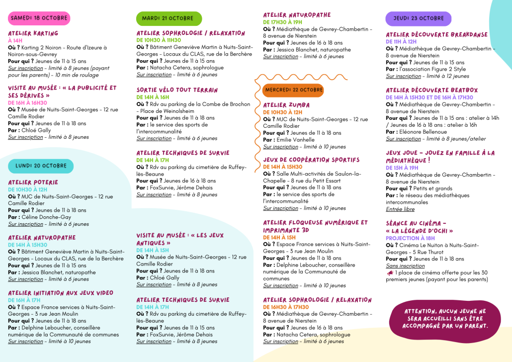 Si vous êtes inscrit et que vous ne pouvez plus venir, merci de prévenir de votre annulation par mail à : semaine.parentalite@ccgevrey-nuits.com, pour libérer la place pour d’autres jeunes.