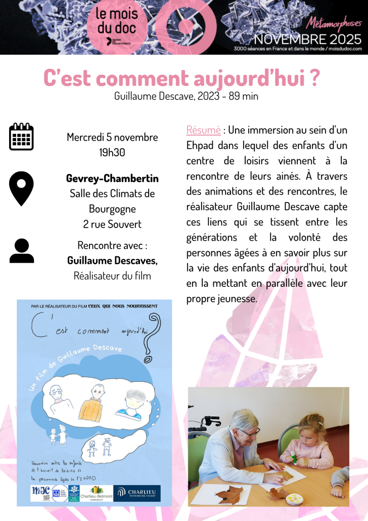 Une immersion au sein d’un Ehpad dans lequel des enfants d’un centre de loisirs viennent à la rencontre de leurs ainés. À travers des animations et des rencontres, le réalisateur Guillaume Descave capte ces liens qui se tissent entre les générations et la volonté des personnes âgées à en savoir plus sur la vie des enfants d’aujourd’hui, tout en la mettant en parallèle avec leur propre jeunesse.