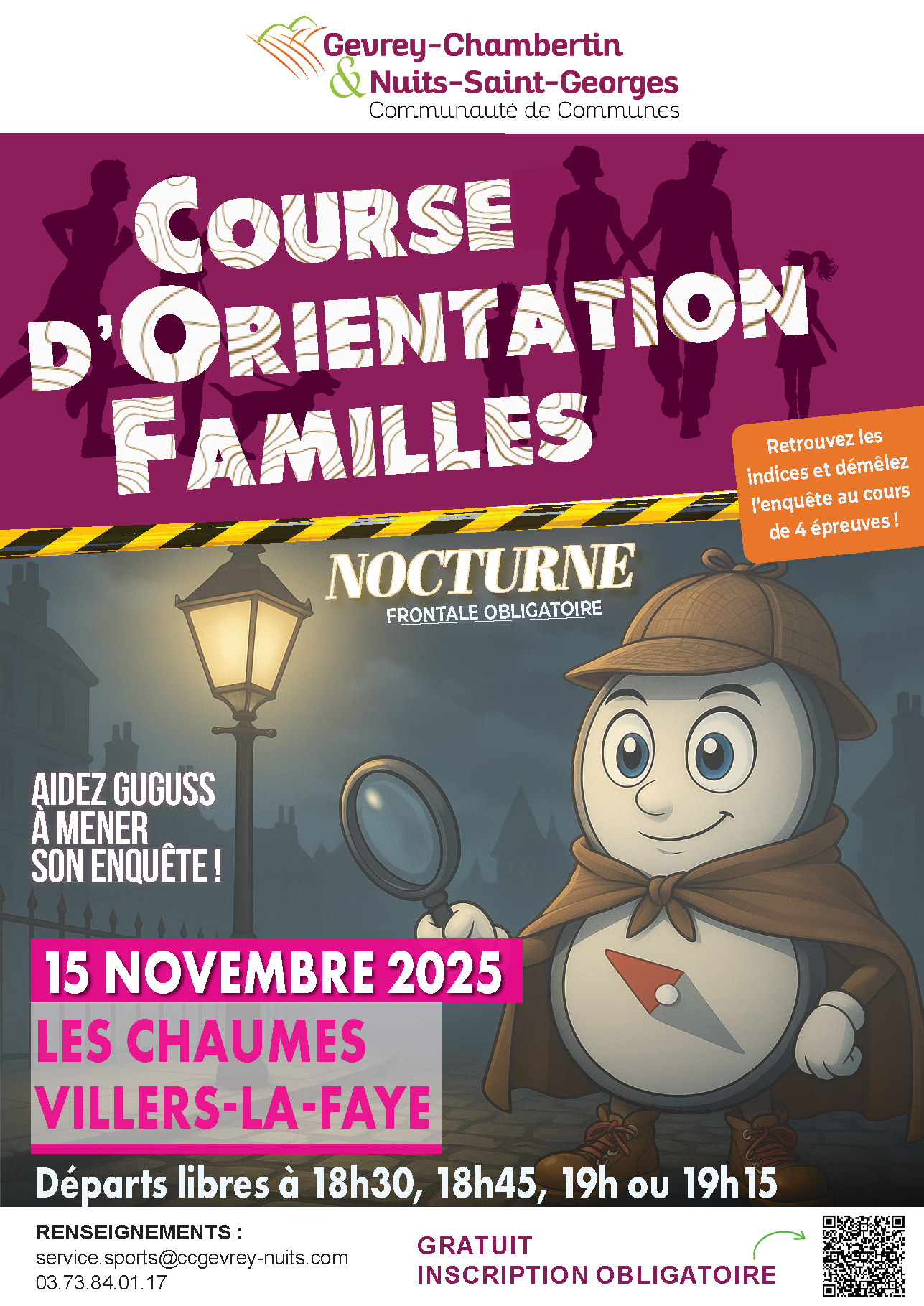 Gugusse mène l’enquête ! Retrouvez Guguss dans ses aventures, cette fois en nocturne ! A l’aide de votre frontale, arpentez les Chaumes de Villers-la-Faye pour retrouver les indices et démêler cette enquête. Nombre de places limité, inscription obligatoire sur un des 4 départs : 18h30, 18h45, 19h, 19h15.