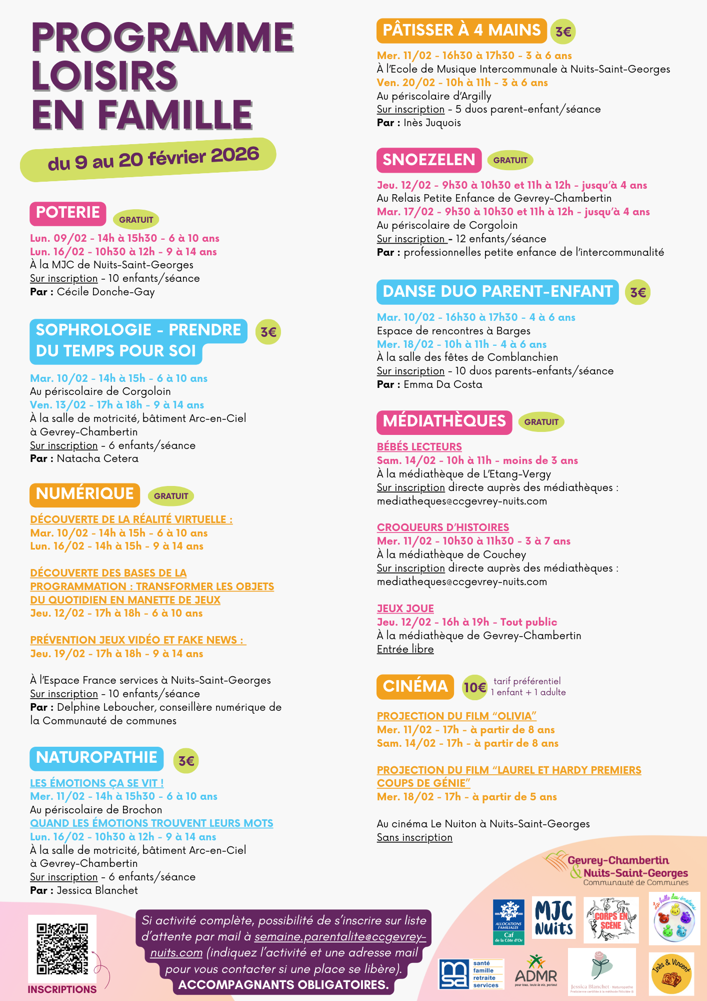 Après le succès de la Semaine de la Parentalité au mois d’octobre, et suite aux résultats de l’enquête « parentalité » menée auprès des familles du territoire en fin d’année 2025, la Communauté de communes, avec le soutien de la CAF de Côte-d’Or, a proposé deux semaines d’animations parents-enfants pendant les vacances scolaires, du 9 au 20 février 2026.