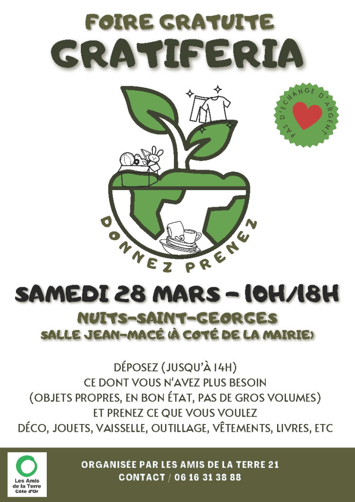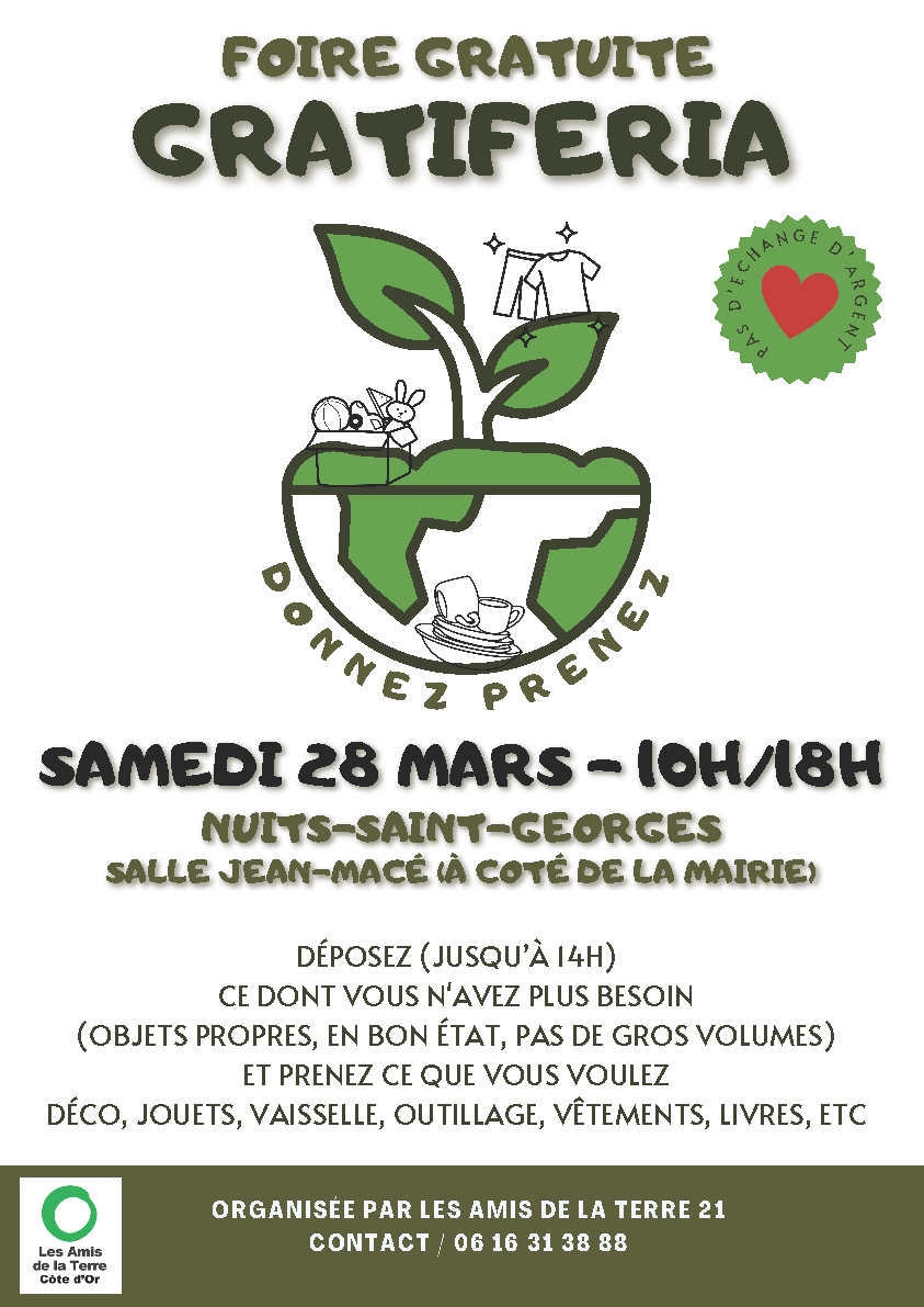 L’association Les Amis de la terre Côte-d’Or, agréée protection de l’environnement, organise à Nuits-Saint-Georges dans la salle Jean Macé (à côté de la mairie) le samedi 28 Mars de 10 heures à 18 heures une GRATIFERIA ou foire gratuite.