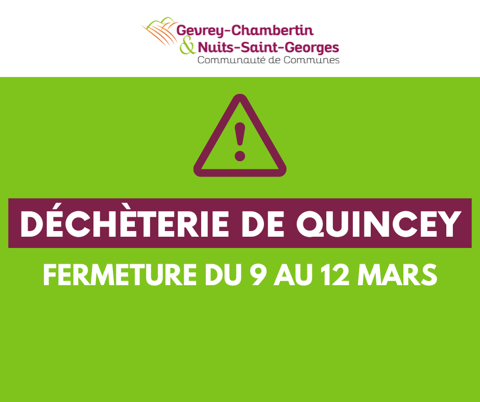 En raison de travaux de réfection de la route d’accès à la déchèterie de Quincey, nous vous informons que celle-ci sera exceptionnellement fermée du 9 au 12 mars inclus.