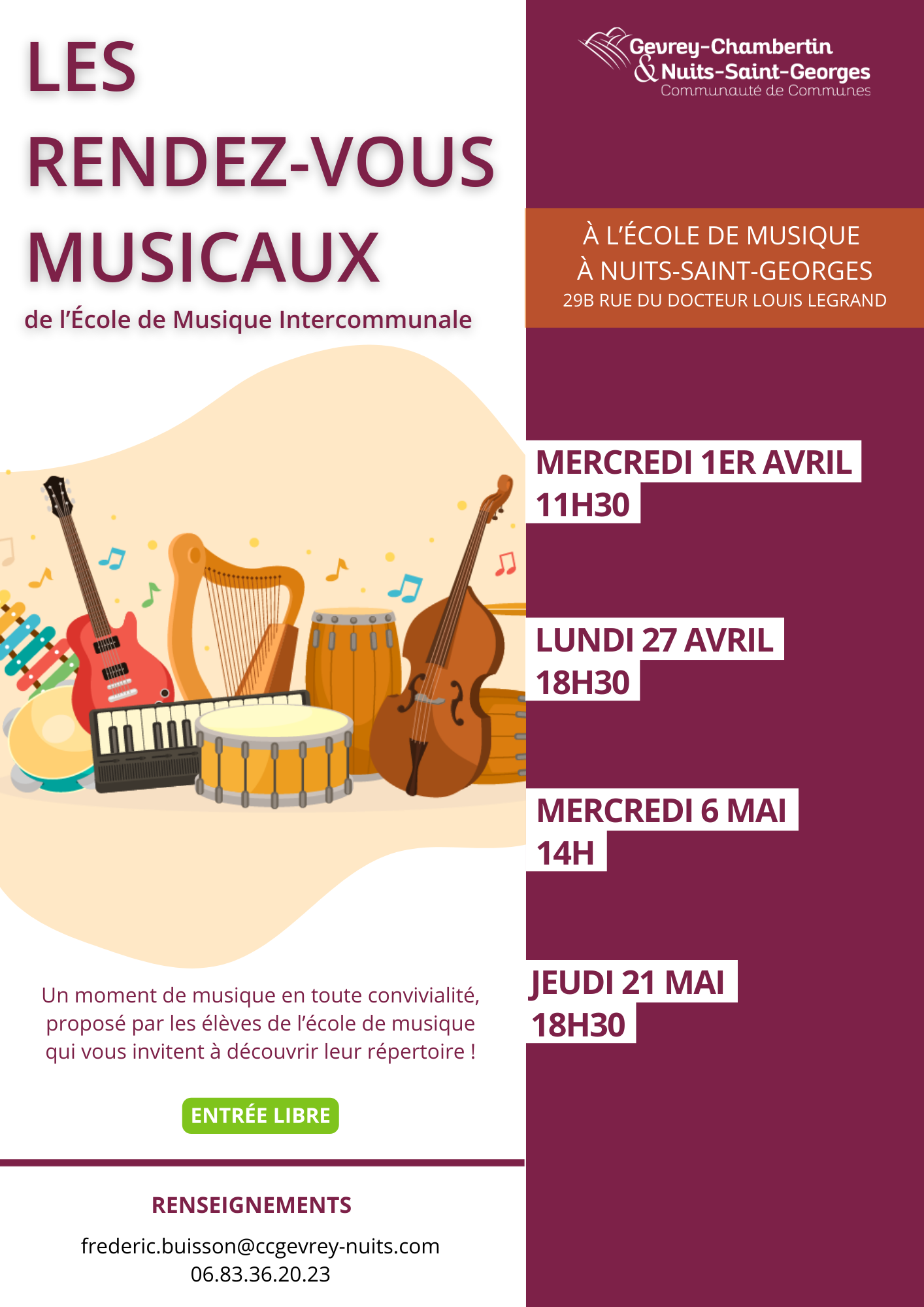 Lieu manifestation : Ecole de musique intercommunale, 29b rue du Docteur Louis Legrand à Nuits-Saint-Georges
