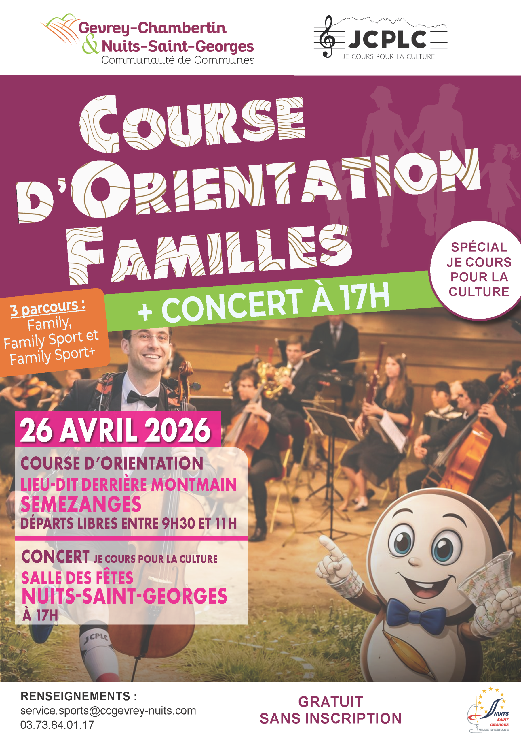 Le service des Sports de la Communauté de communes vous propose une nouvelle Course d’Orientation Familles dans une version Course d’orientation / Concert. Venez explorer les sentiers de Semezanges le matin et assister à un concert classico-loufoque, en partenariat avec le Festival Je Cours pour la Culture, à 17h à la salle des Fêtes de Nuits-Saint-Georges.