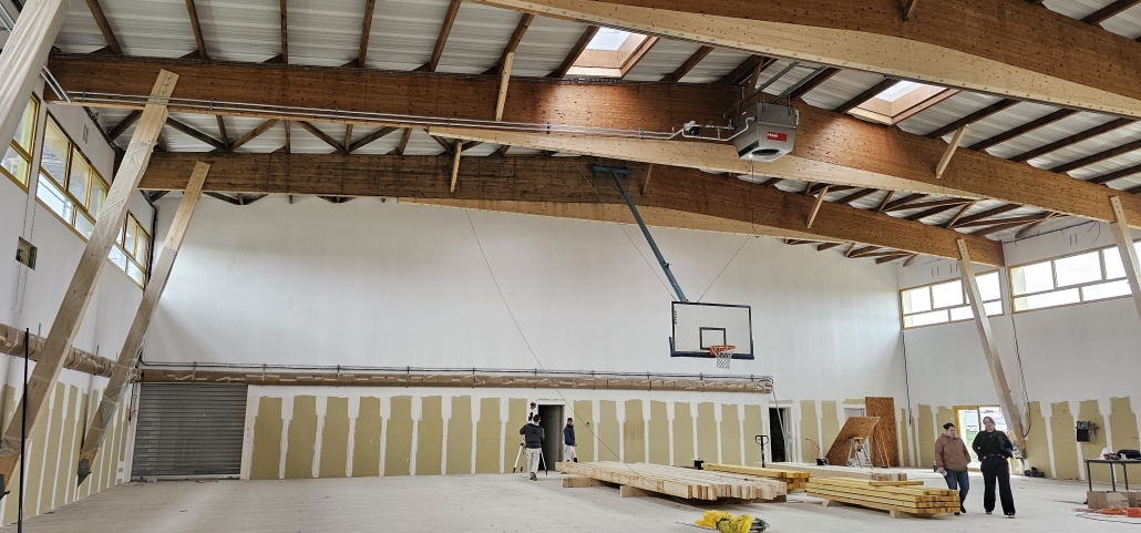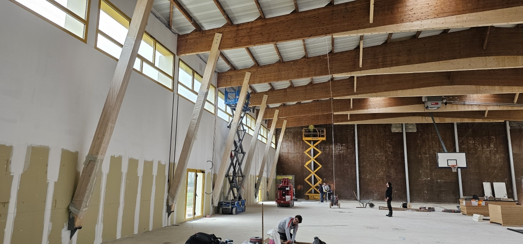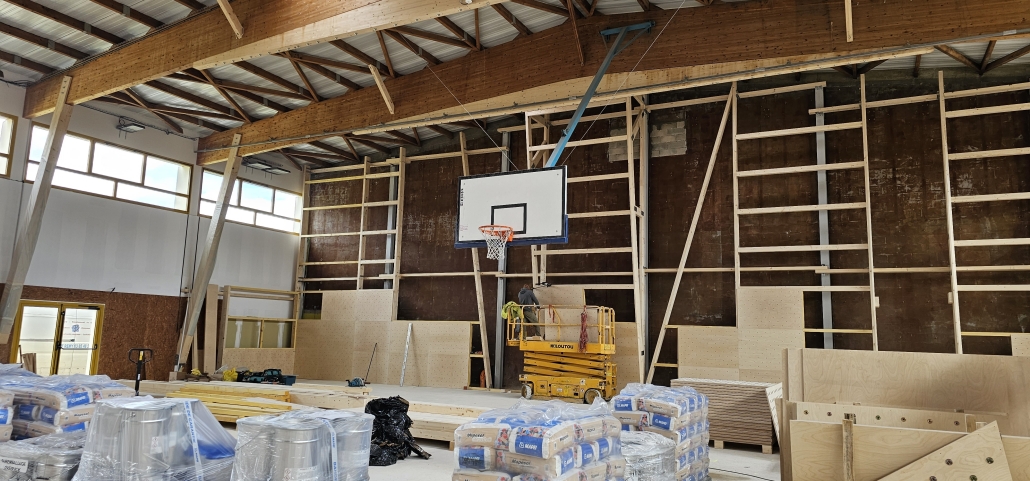 Les travaux de rénovation énergétique du gymnase Jérôme Golmard de Brochon se poursuivent à un bon rythme. La phase de gros œuvre est désormais bien avancée : à la mi-mars, les équipes procédaient notamment à la pose des ossatures métalliques, au rabotage du sol existant avant la mise en place du nouveau revêtement, au début de la pose des soubassements en bois à l’intérieur du bâtiment ainsi qu’à la pose du nouveau mur d’escalade.