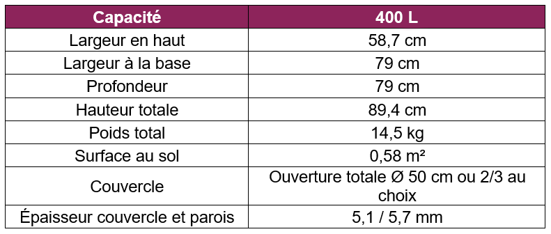- Modèle 400 L en plastique, à 40€ TTC l’unité. Distribué en 1 colis de 90 cm de cotés et 20 cm d’épaisseur. Délivrés avec un bioseau. Pour la facturation, une ligne est ajoutée à la prochaine redevance incitative.