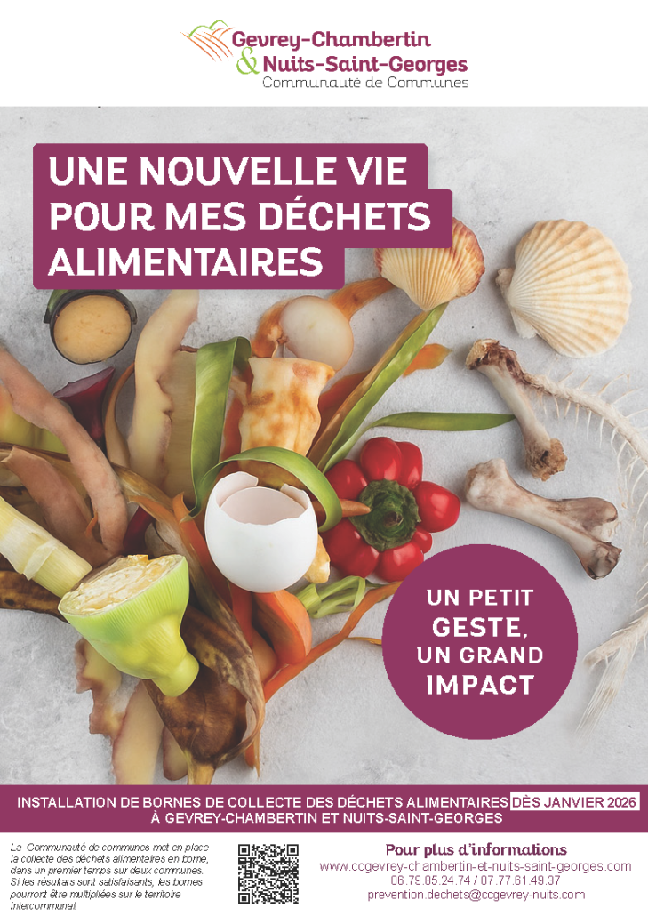 - A compter de janvier 2026, une collecte séparée en point d’apport volontaire est mise en place par l’intercommunalité, dans un premier temps dans les deux plus grandes communes du territoire : Nuits-Saint-Georges et Gevrey-Chambertin. Si les résultats sont satisfaisants, les bornes pourront être multipliées à l’avenir sur le territoire. Ce dispositif cible prioritairement les habitants de logements collectifs, dépourvus de solution de compostage individuel.